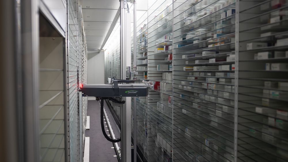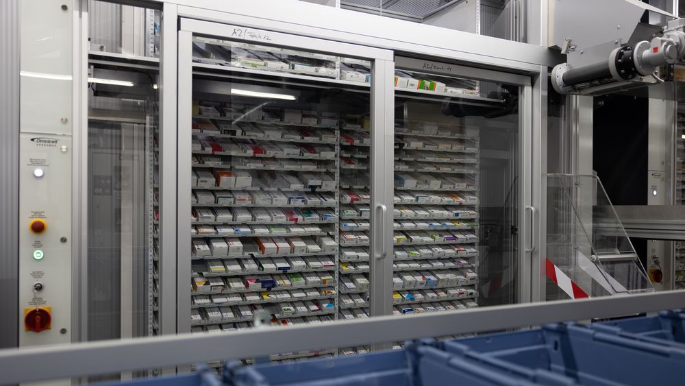 Das automatische Förderband transportiert drei Schachteln mit Schmerztabletten in eine bereitstehende graue Plastikkiste. Darin befinden sich bereits über ein Dutzend weiterer Schachteln diverser Formate und Grössen mit Medikamenten. Der Roboter, zu dem das Förderband gehört, sucht die Arzneimittel aus dem Medikamentenschrank zusammen.